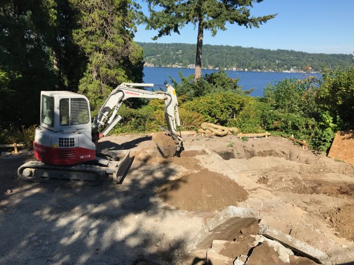 It was really amazing how quickly the foundation was removed. It shows the importance of adding steel to the concrete when it’s poured, which we had none. Randall the excavator showed up bright and early the next day and we setup the laser to give us elevation and quickly graded the site. From there the string lines were set back up to give Randall a guide to dig for the new foundation. We again setup the laser to show where the bottom of the new foundation is while digging. In this case it was 2′-9″ below the existing grade.