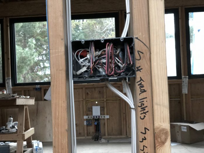 Electrical came next. We have a lot of electrical requirements and the crew came in and got most of it done in 2 weeks. They started by running “home runs” of romex wire to the service panel location. After a few days there was a large raceway of wires running from the top floors down. At the same time others on the crew were laying out and installing recessed lights, outlets, etc.. We have a “reflective ceiling” plan that described a lot of the electrical but it was a dance to get everything we wanted installed and in the right place. Eventually all the lights and outlets were wired up and all the home runs were pulled. The next task was to put in the service panel and connect all the runs to it. Lastly they ran a big fat wire from the panel to the outside and connected up the meter box and mast. The only thing that needs to be done now is hook up power from the utility pole to the mast. We almost have light!