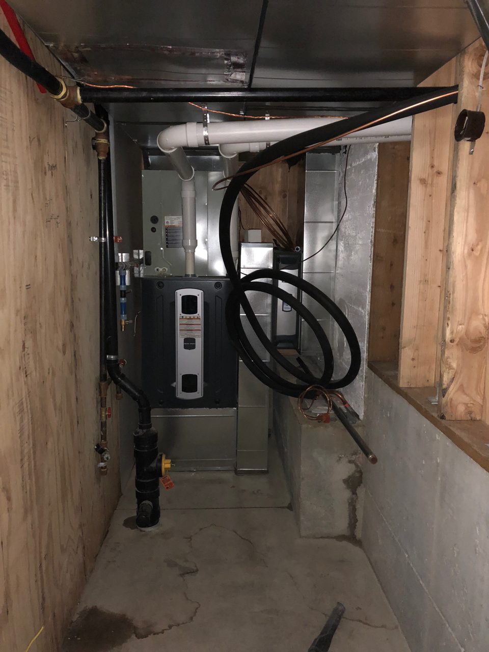 The crew started by running large metal ducts across the ceiling in the mechanical room (pictured above). From there they branched off of those ducts for supply (send conditioned air out) and return (bring the air back). The whole thing was laid out so most of the visible duct work is in the basement. The smaller branches go up through interior walls. The 6″ circular ducts convert to oval in many of these case so the duct will fit in a 2 x 4 wall cavity. Once all the ducts were installed they went to work and connected the furnace to the large ducts. The heat pump will get installed outside once the siding is on and the earth is graded. The box on top of the furnace (in the picture above) contains coils that connect to the heat pump. This allows the heat pump to condition the air as it passed over the coils.
